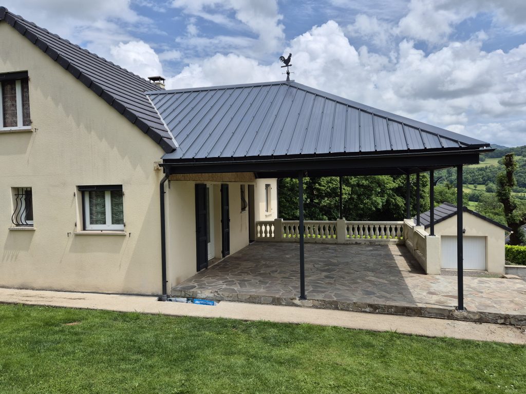 Vérandamix a conçu et installé un auvent à structure acier thermolaqué avec une toiture en panneaux isolants surmontée d’une sur-toiture en bac acier pour une maison cantalienne.
