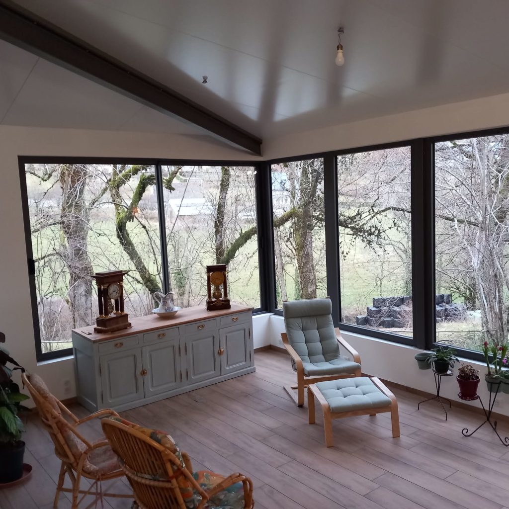 Cette véranda sur mesure s’intègre parfaitement à l’architecture de la maison en pierre, tout en lui apportant une touche de modernité et de confort.